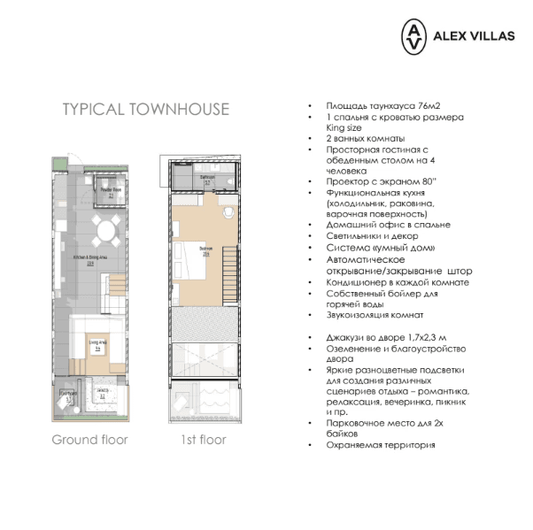 The complex includes 10 townhouses that provide a mid-range luxury option between the apartments and the larger villas. These units maximize vertical space and offer a stylish, multi-level living experience. Like the rest of the development, they benefit from the shared infrastructure and 24/7 security of the Alex Villas management system.